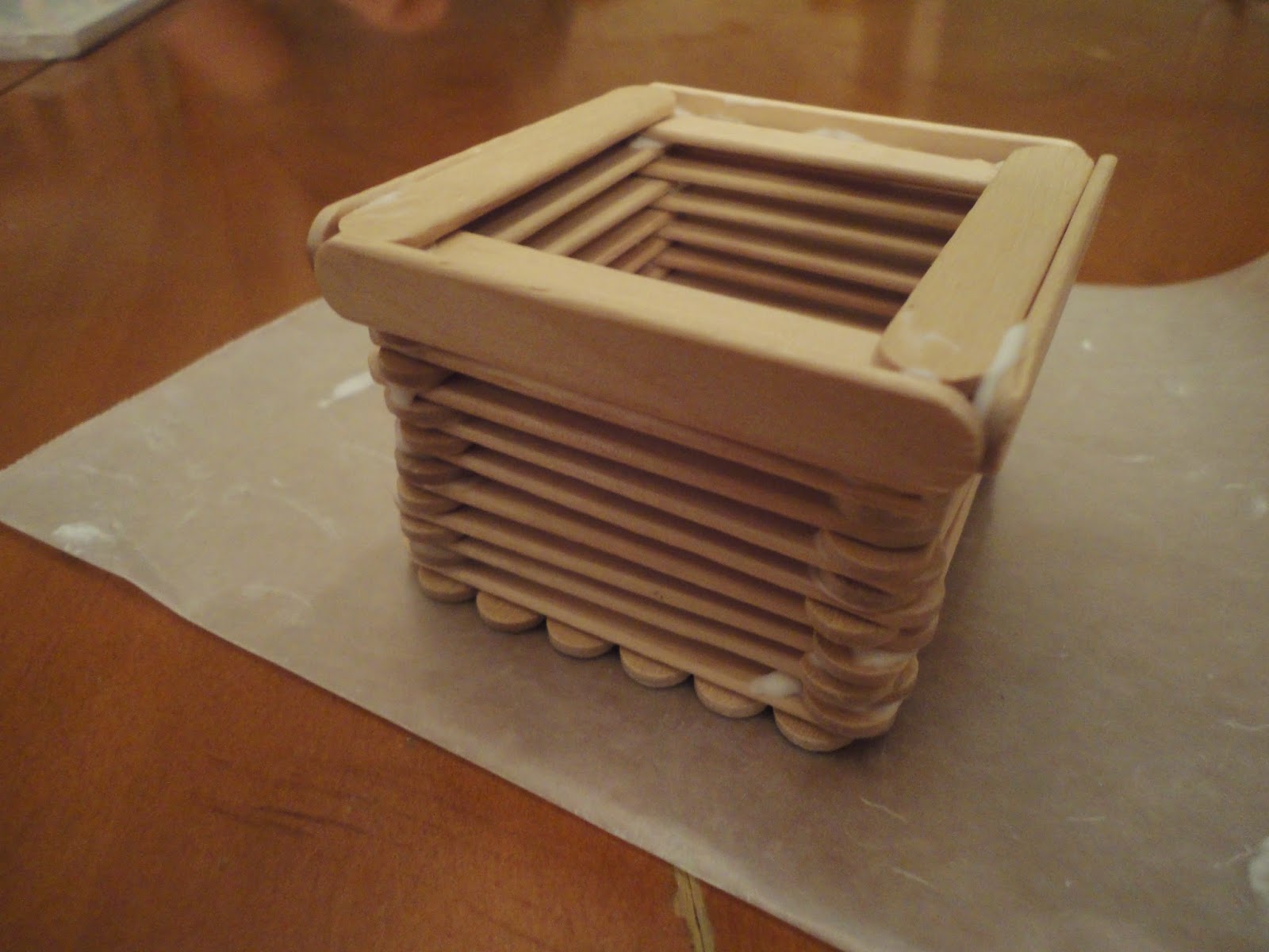 The base of the basket was made out of six wooden popsicle sticks from the craft store. I glued them together and set the base on wax paper so it wouldn't stick to my table. Then I built the sides of the basket by layering them, as you can see in the pictures. Pretty neat, huh?
